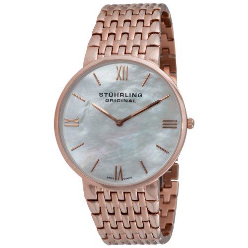 The stunning display of the Stuhrling Original Men's Meydan Concourse Classic Swiss Quartz MOP Dial Watch gives it a sophisticated style sure to turn heads. This timepiece offers a round high-polished rose-gold-tone stainless steel case and beveled bezel. A stunning mother-of-pearl dial displays rose-gold-tone Roman numerals at the three, six, nine, and 12 o'clock hours while rose-gold-tone matchstick indices mark all other hour positions .Sleek rose-gold-tone hour and minute hands complement the matchstick indices with similar style. The rose-gold-tone stainless steel link bracelet features an intricate tongue-and-groove design adding to the watch's sophisticated style. The bracelet securely fastens with a deployment clasp. This Stuhrling Original timepiece offers reliable Swiss quartz movement and is protected by a durable mineral crystal. The watch is water resistant to a depth of 99 feet (30 meters).