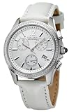 Women's Aura Pro 200 watch from Golana. Swiss-made battery powered quartz movement. Polished and brushed silver-tone stainless steel case. Round polished silver-tone bezel with single rim of diamonds. Silver mother-of-pearl dial. Silver-tone Arabic numeral at 12 o'clock, lines at remaining hours. Silver-tone hour and minute hands, central silver-tone second hand. Chronograph, 1/10th second, 30 minute, and 60 second subdials. Date at 4 o'clock. Scratch-resistant anti-reflective sapphire crystal. Push and pull crown. White genuine leather strap. Fold-over clasp. Case: 34mm wide x 40mm long x 11mm thick. Strap: 17mm wide. Strap fits up to 9in wrist. Water resistant to 100 meters (330 feet). We are pleased to offer our two-year limited warranty on this fine watch. This item must be in its original condition, with all tags attached and original packaging intact, in order to be accepted for return.